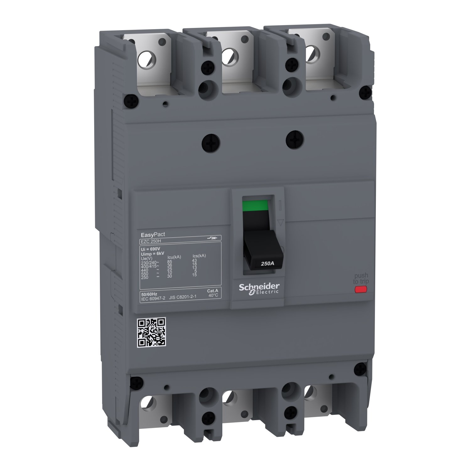 The Schneider EZC250H3125 is a 3-pole molded case circuit breaker (MCCB) from the EasyPact EZC250H series, designed for reliable protection of electrical installations. It features a fixed Thermal-Magnetic (TMD) trip unit, providing dependable protection against overload and short-circuit conditions.