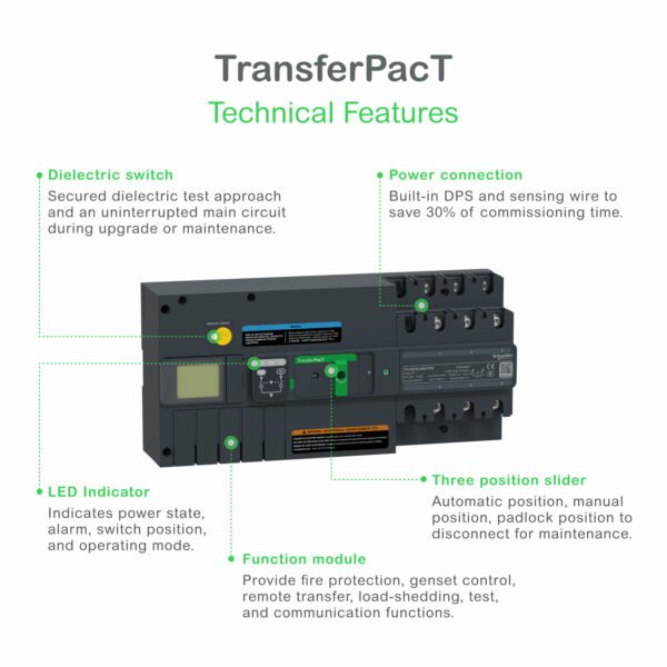 Protection: The device includes integrated protection features such as overload and short circuit protection, ensuring that the transfer switch and connected equipment are safe from electrical faults.